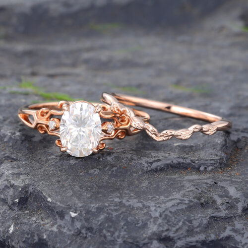 Vintage Oval Moissanite Engagement Ring Set Art Deco Filigree Bridal Ring Set