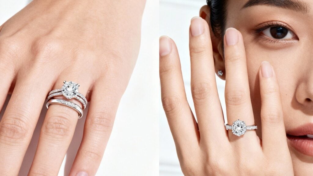 In contrast, several Eastern cultures follow different customs. For example, in China, it is common for brides to wear the engagement ring on the left hand but the wedding band on the right, representing the idea of balance—left for the heart, right for strength and responsibility. In some Southeast Asian regions, wedding jewelry traditions are even more symbolic, often tying the ring placement to family customs or spiritual beliefs. Meanwhile, couples in modern Asian cities—such as Hong Kong, Singapore, and Tokyo—have increasingly adopted Western stacking styles while blending them with local traditions.