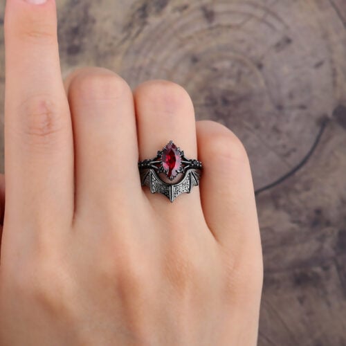 Center diamonds, black diamonds, colored gemstones like emeralds, rubies, and sapphires all complement black gold beautifully. The contrast creates a bold, elegant, and timeless design.