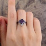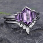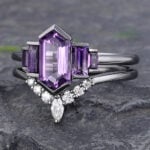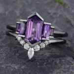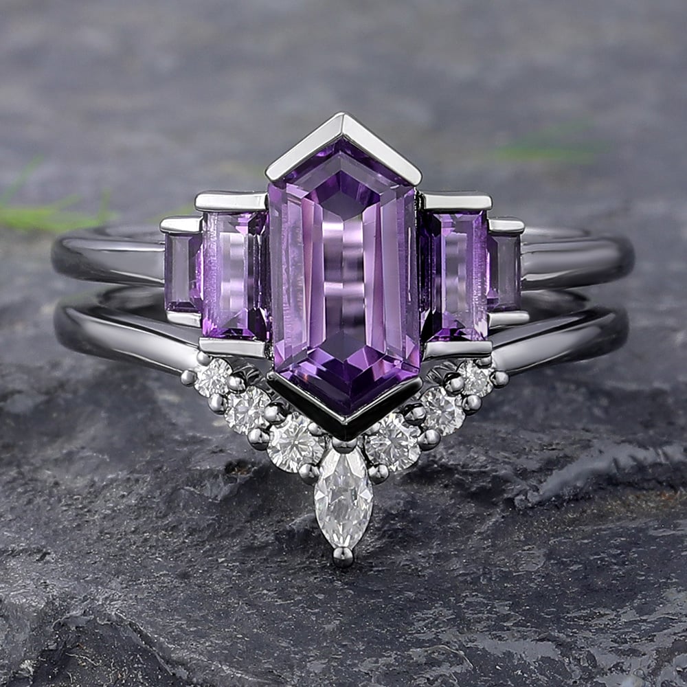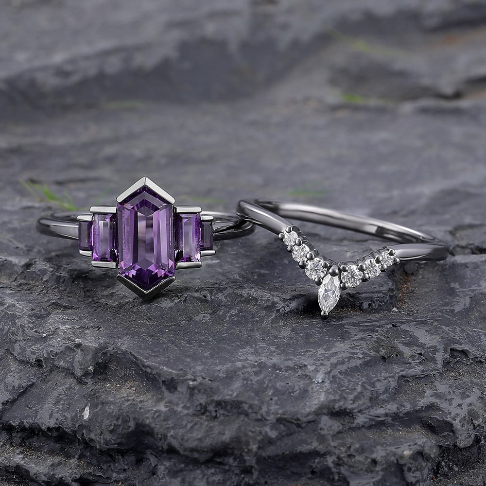 Art Deco Elongated Hexagon Cut Amethyst Engagement Ring Set