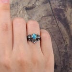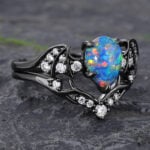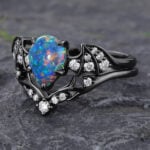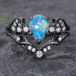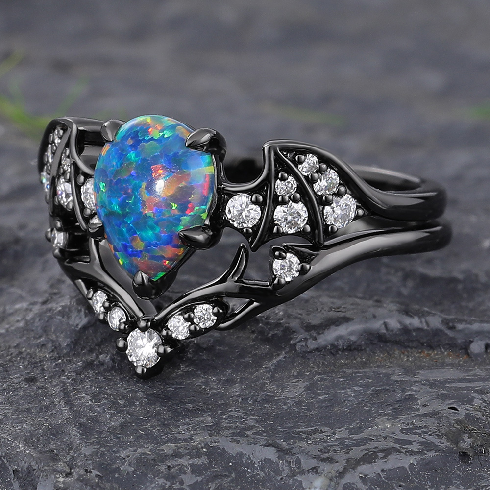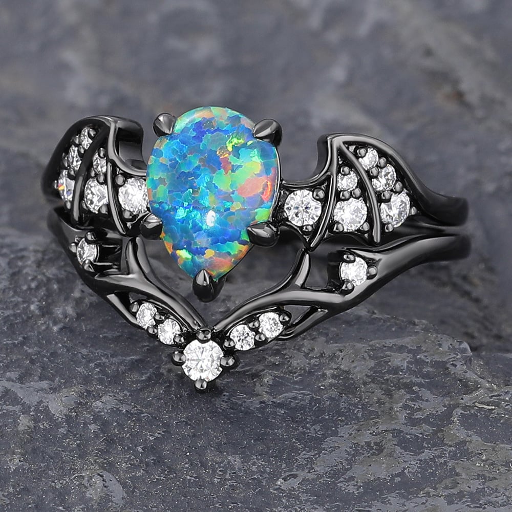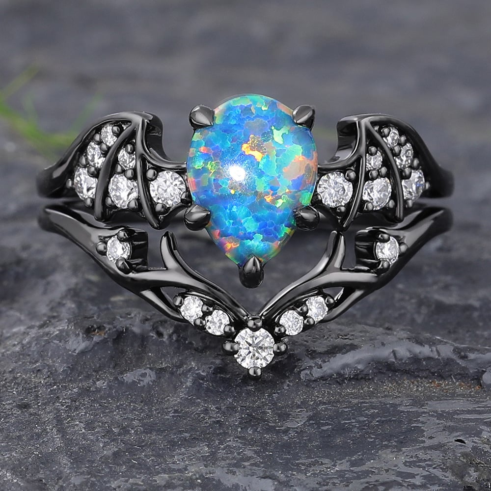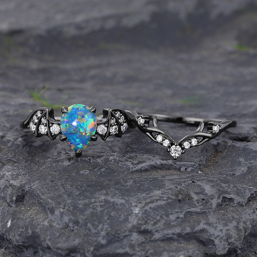 Batwing Gothic Pear Shaped Black Opal Engagement Ring Set