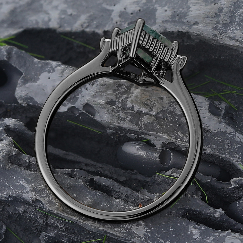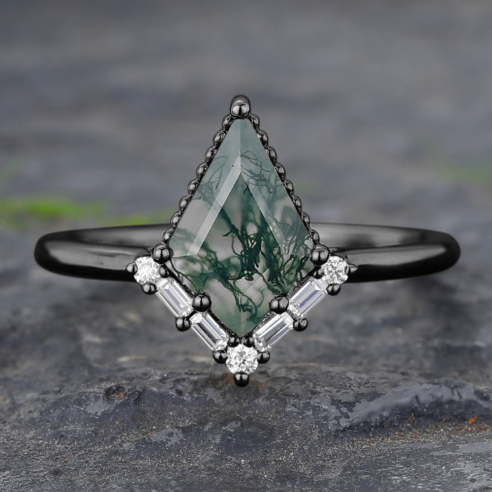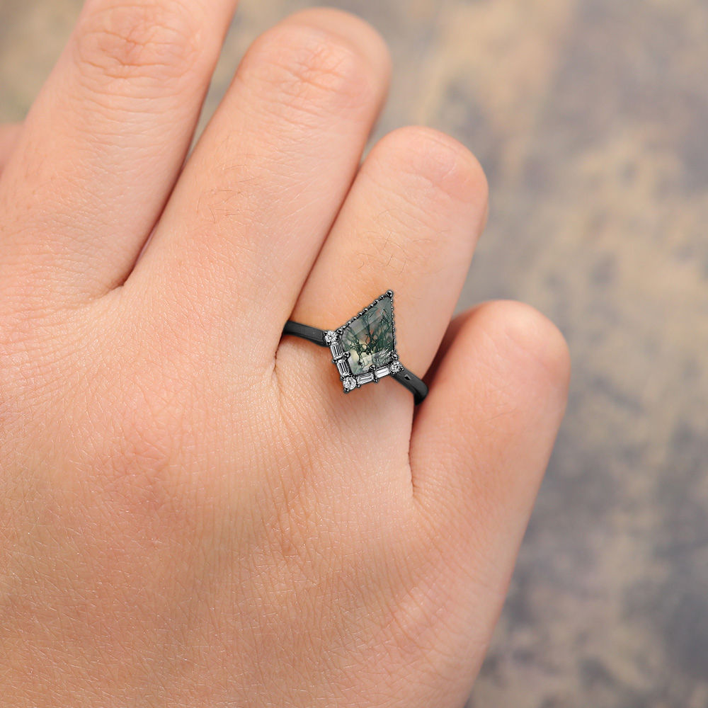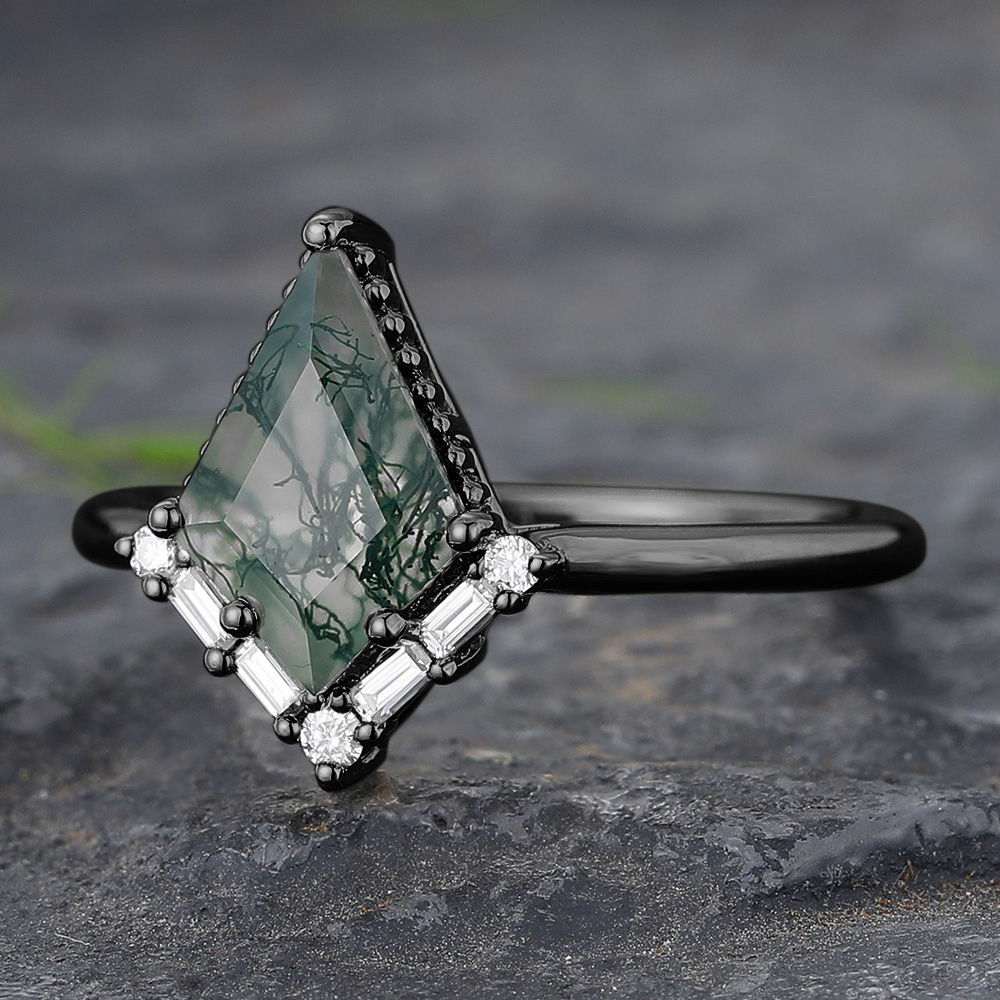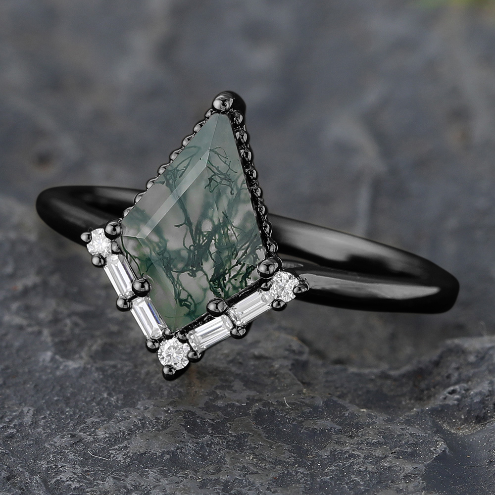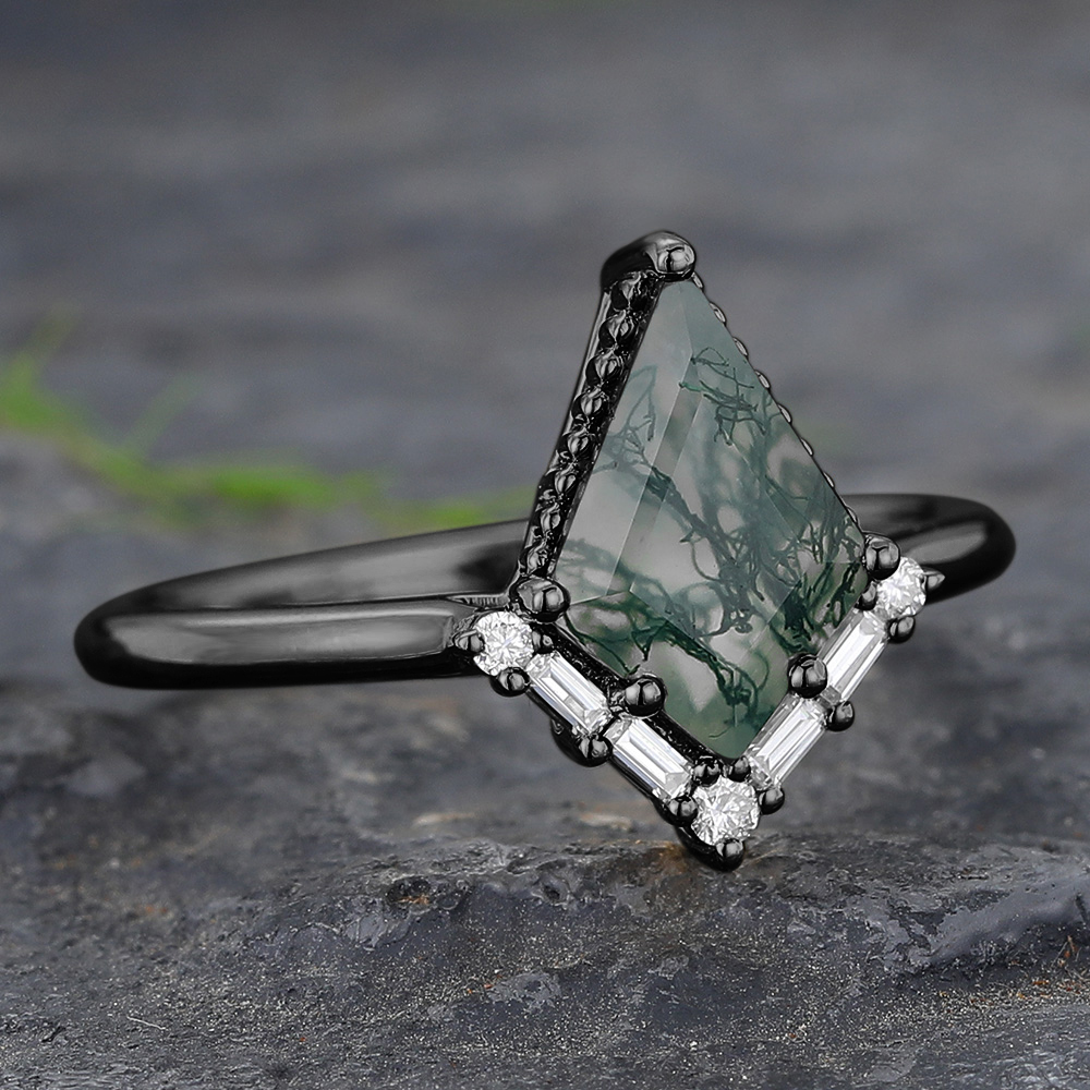 Black Gold Kite Cut Moss Agate Engagement Ring with Baguette Accented