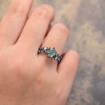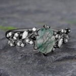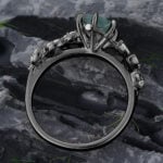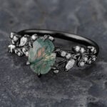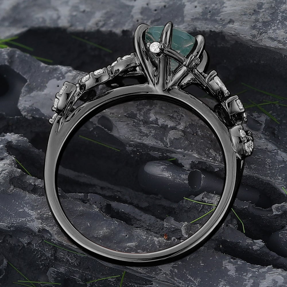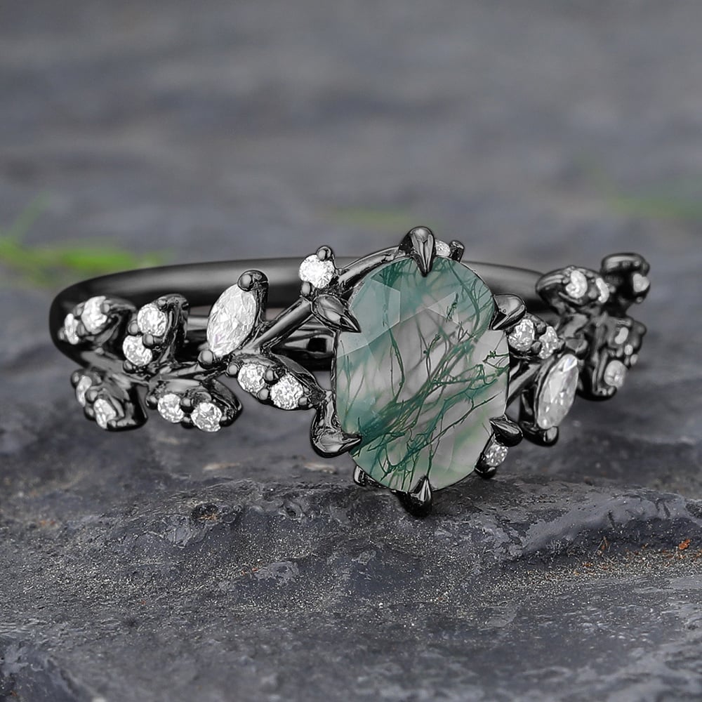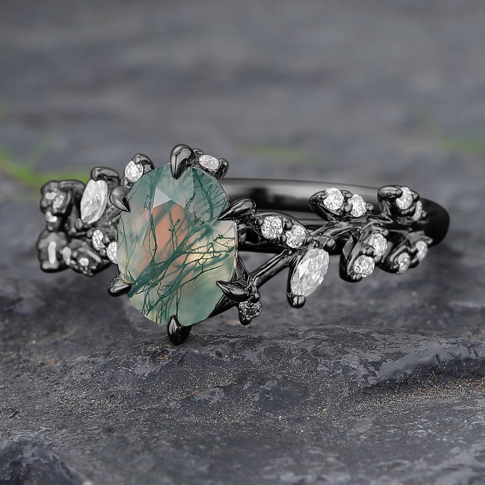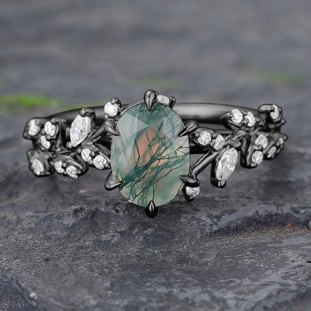 Black Gold Oval Cut Moss Agate Leaf Design Engagement Ring