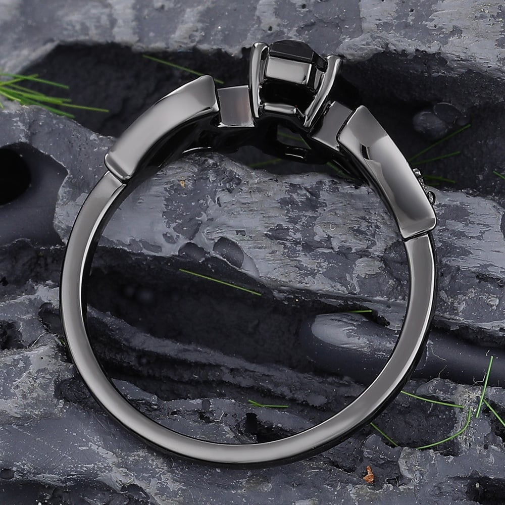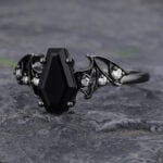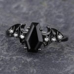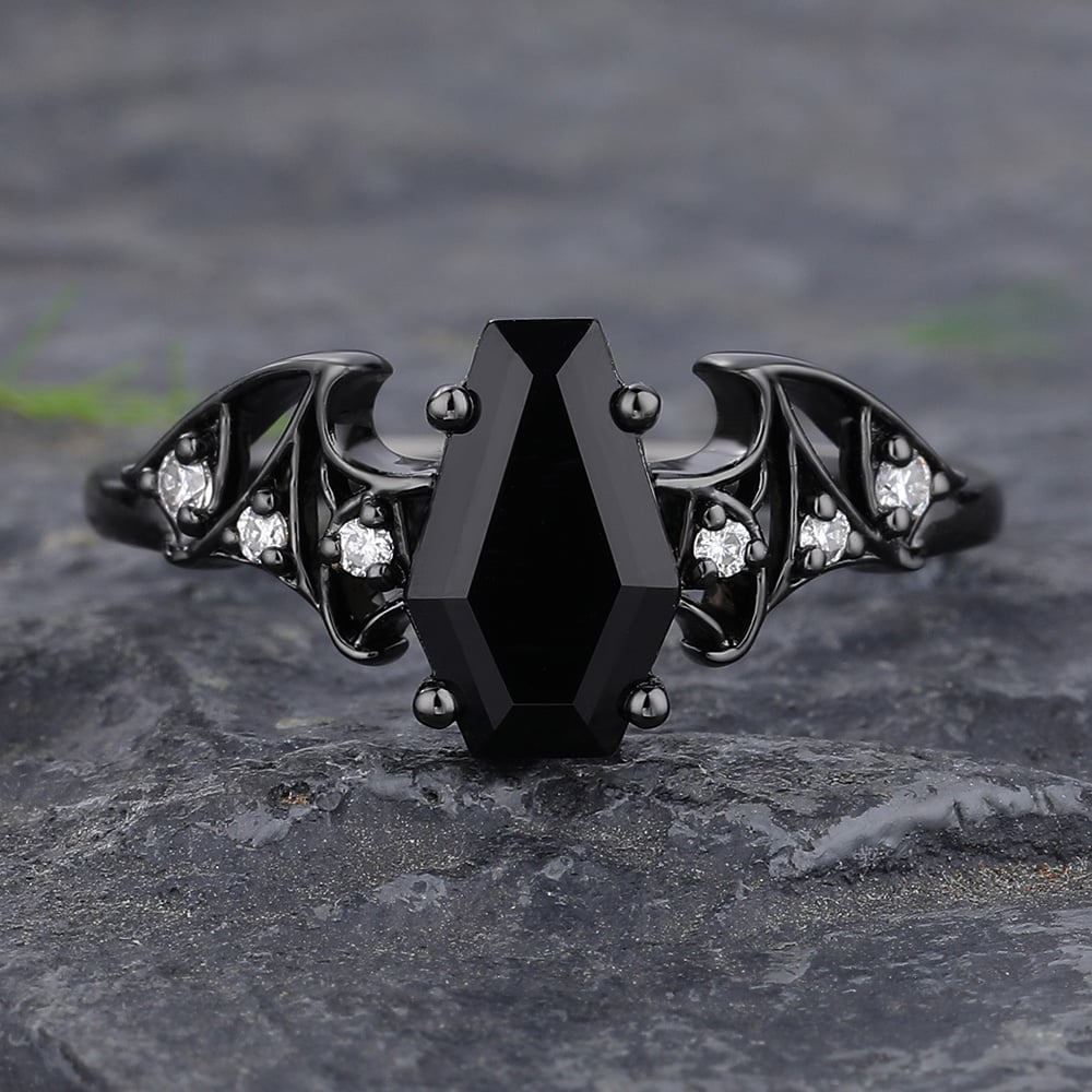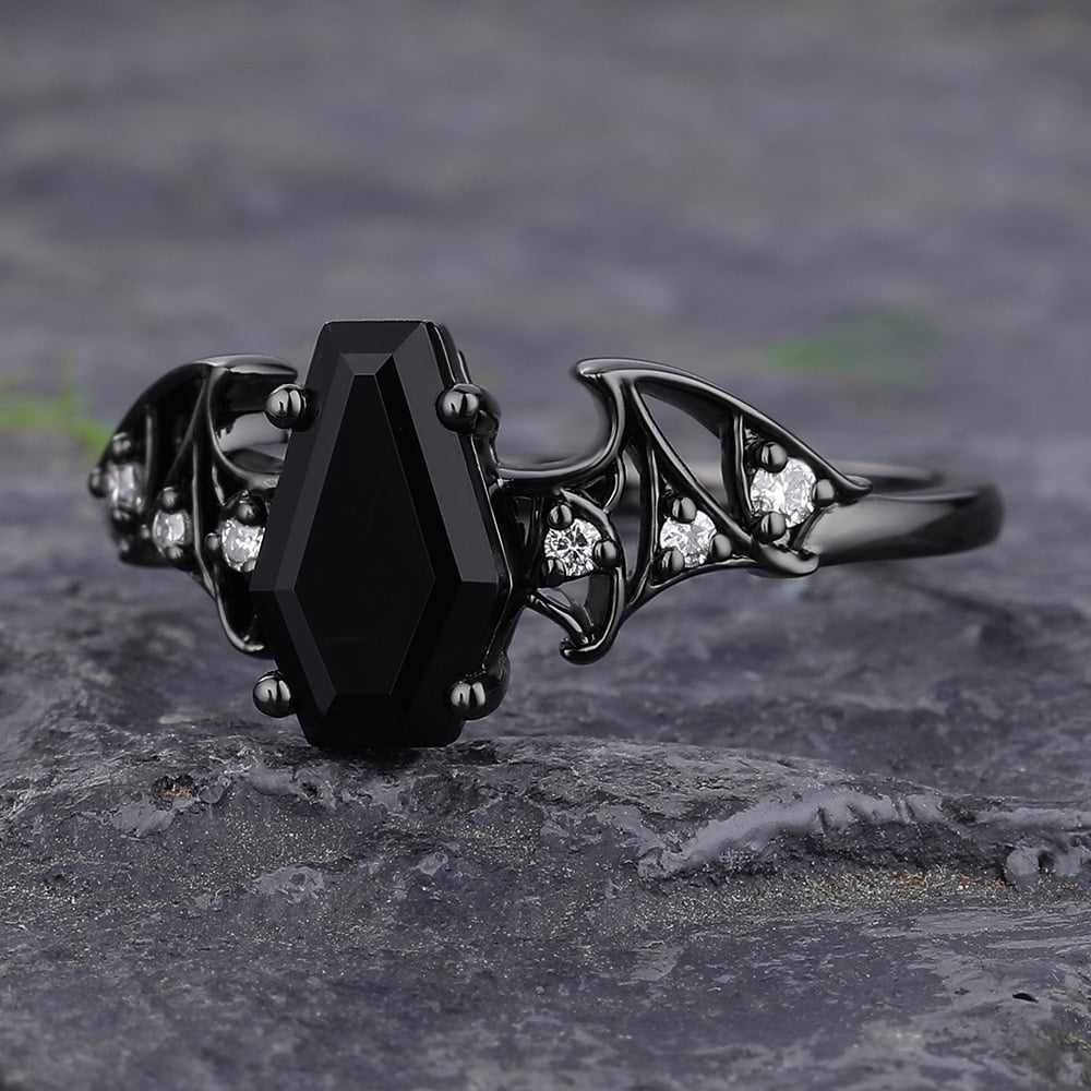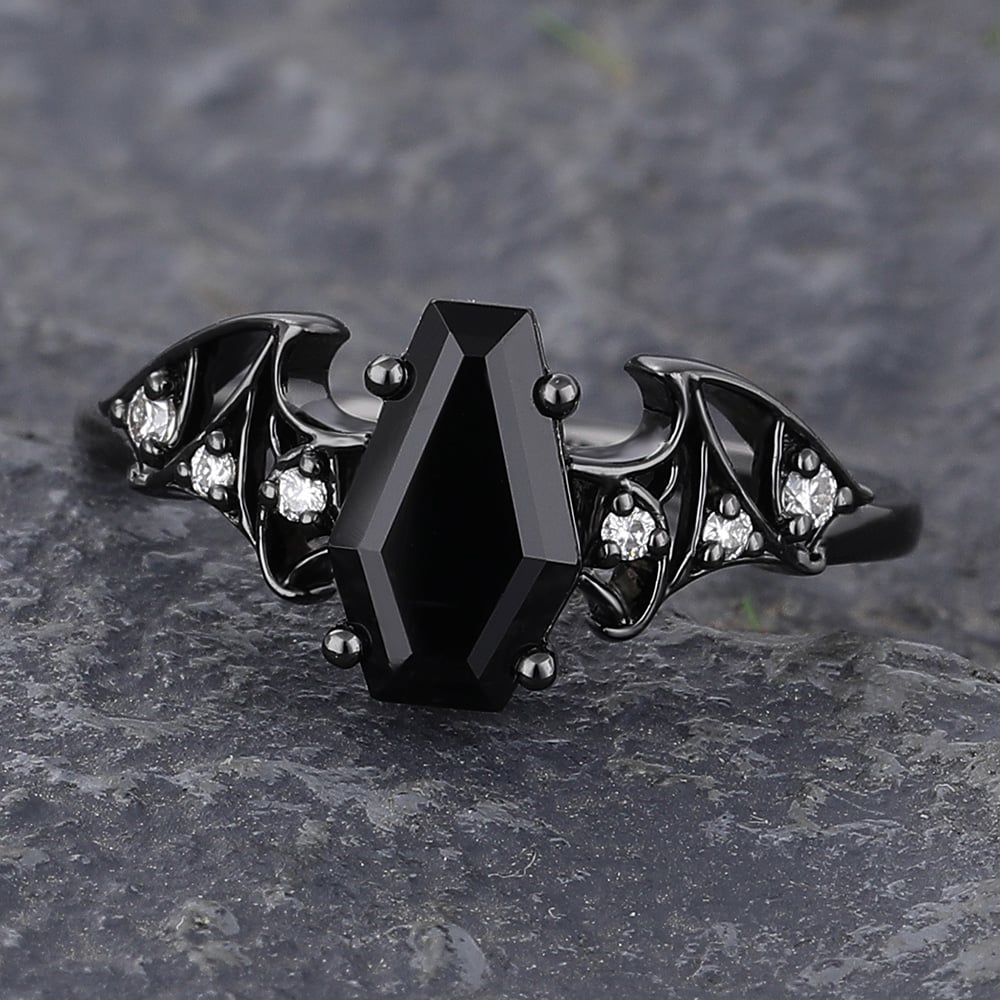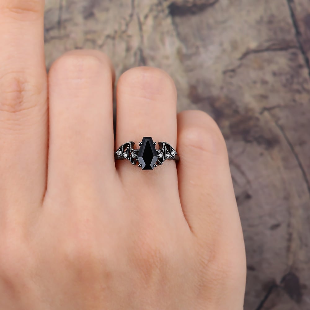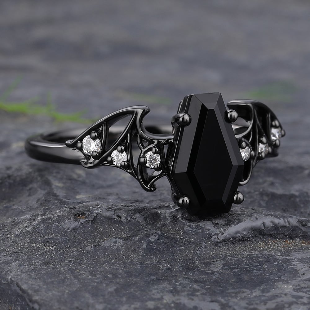 Coffin-Shaped Black Onyx Engagement Ring with Batwing Design
