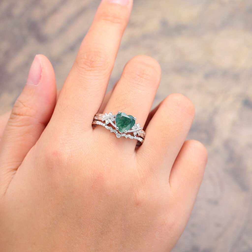 Everlasting Heart Shaped Moss Agate Crossover Engagement Ring Set