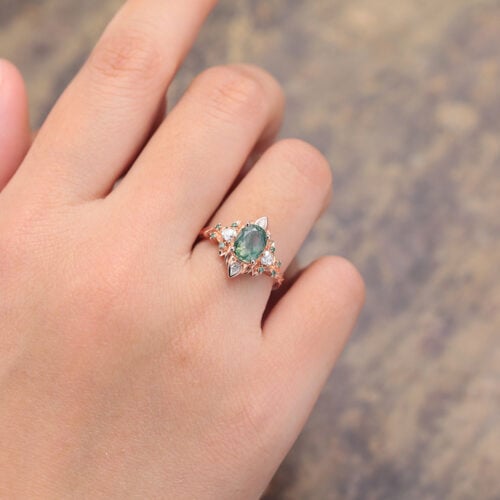 Floral Oval Cut Moss Agate Split Shank Engagement Ring