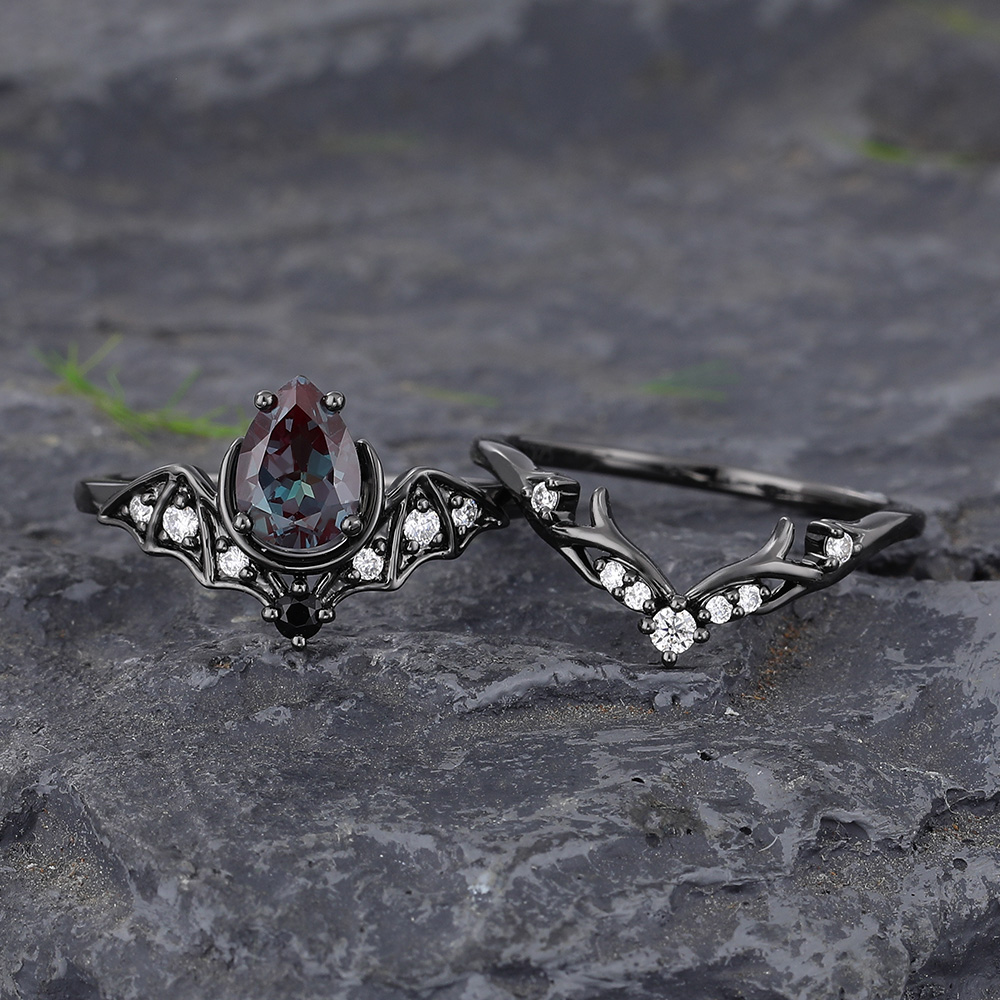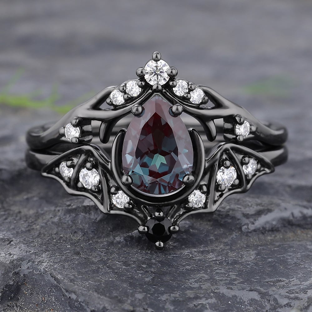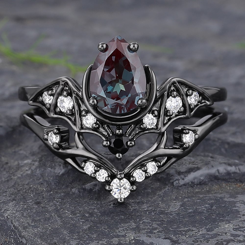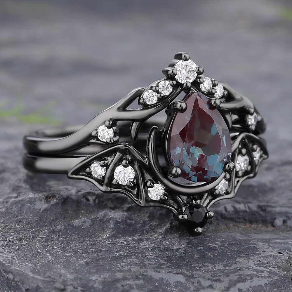 Gothic Pear Shaped Alexandrite Engagement Ring Set Batwing Design