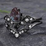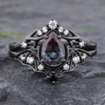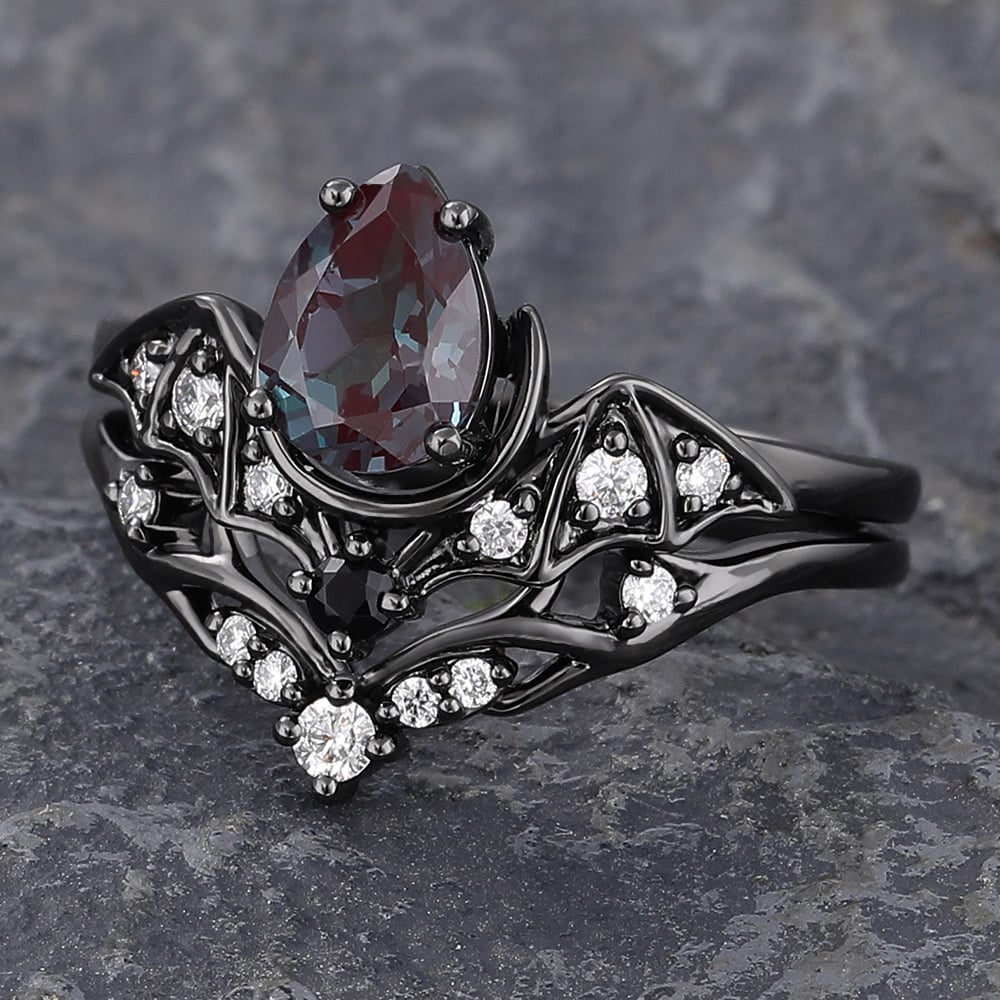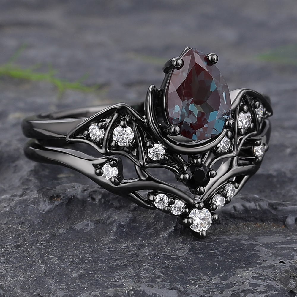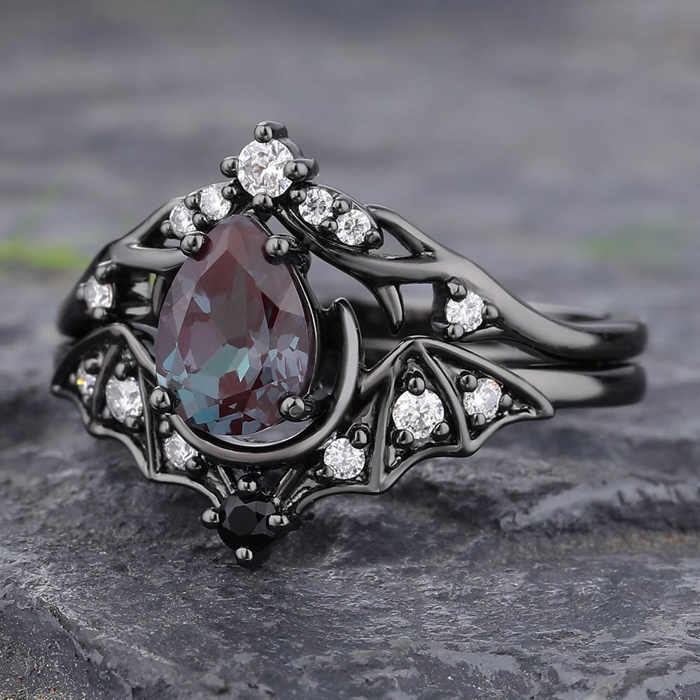 Gothic Pear Shaped Alexandrite Engagement Ring Set Batwing Design