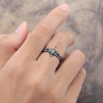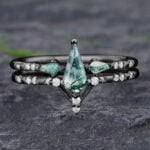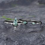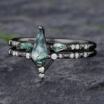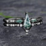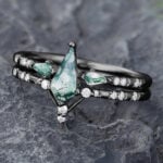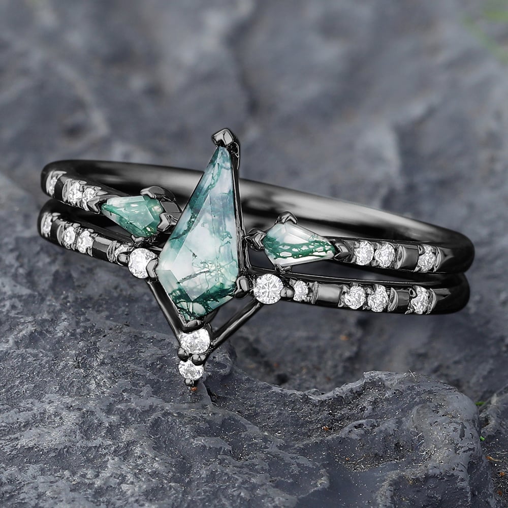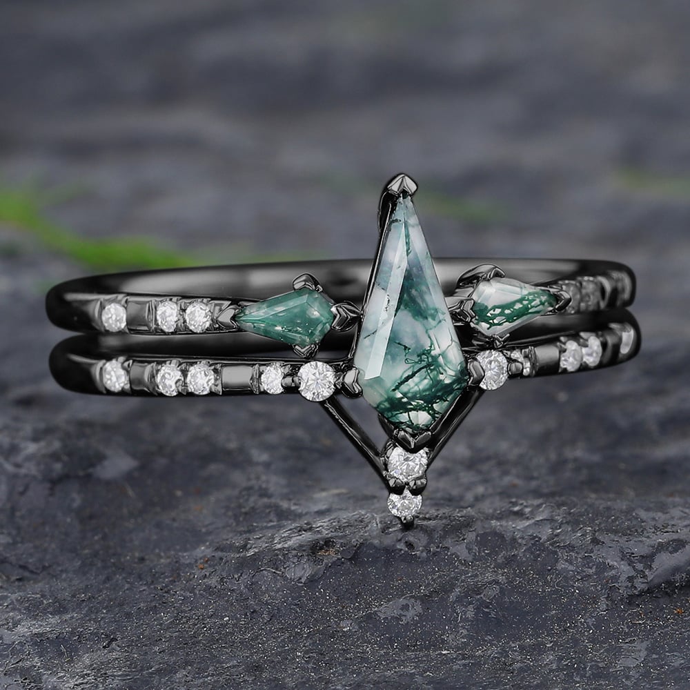 Kite Cut Moss Agate Black Gold Engagement Ring Set