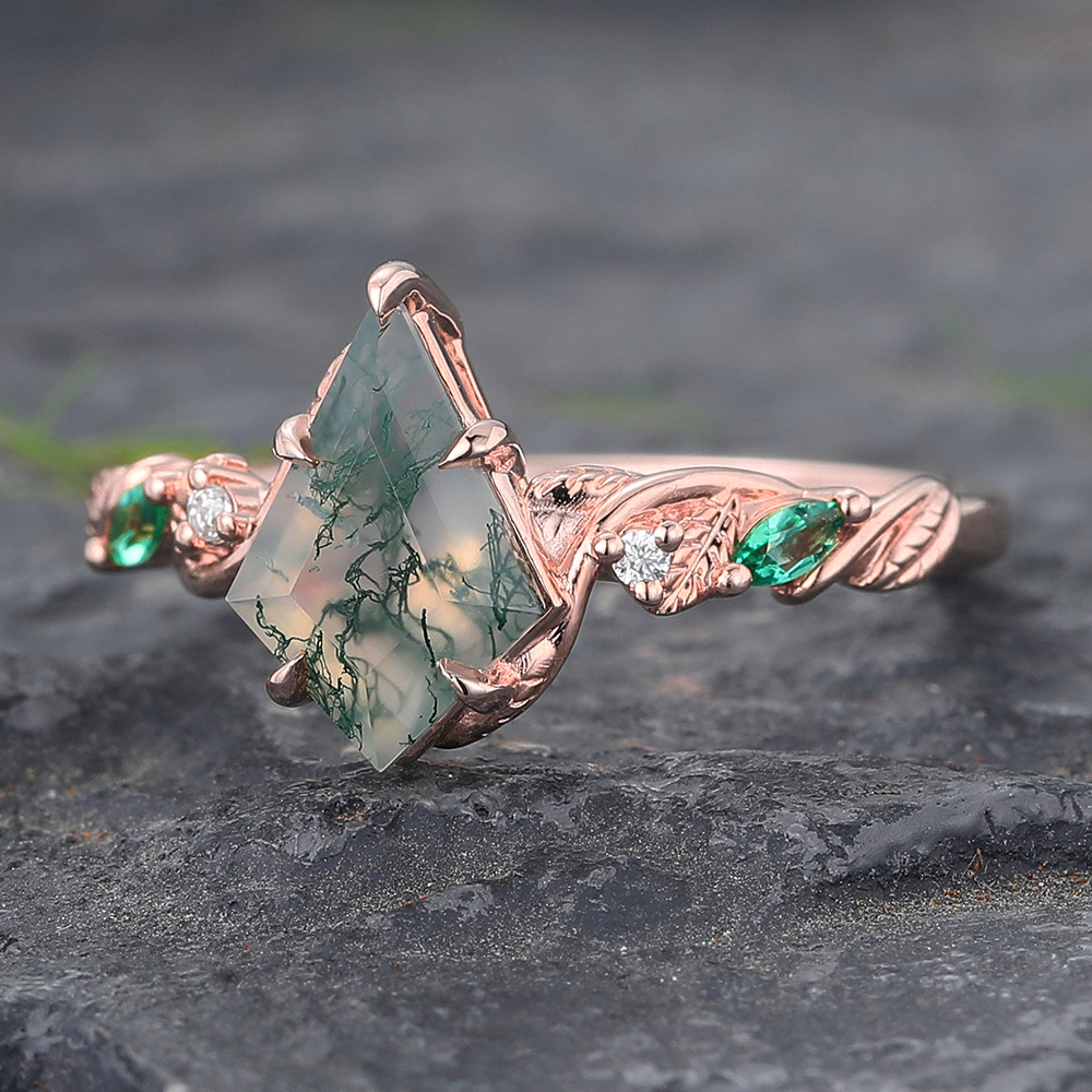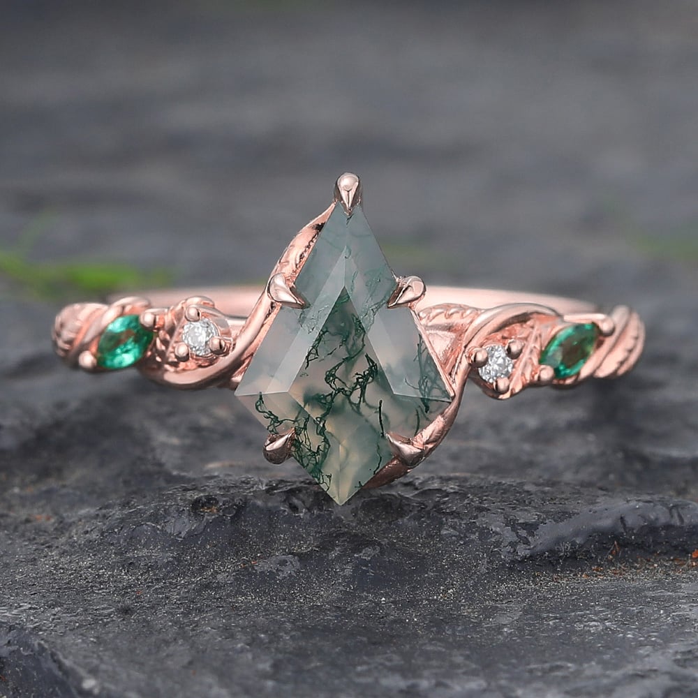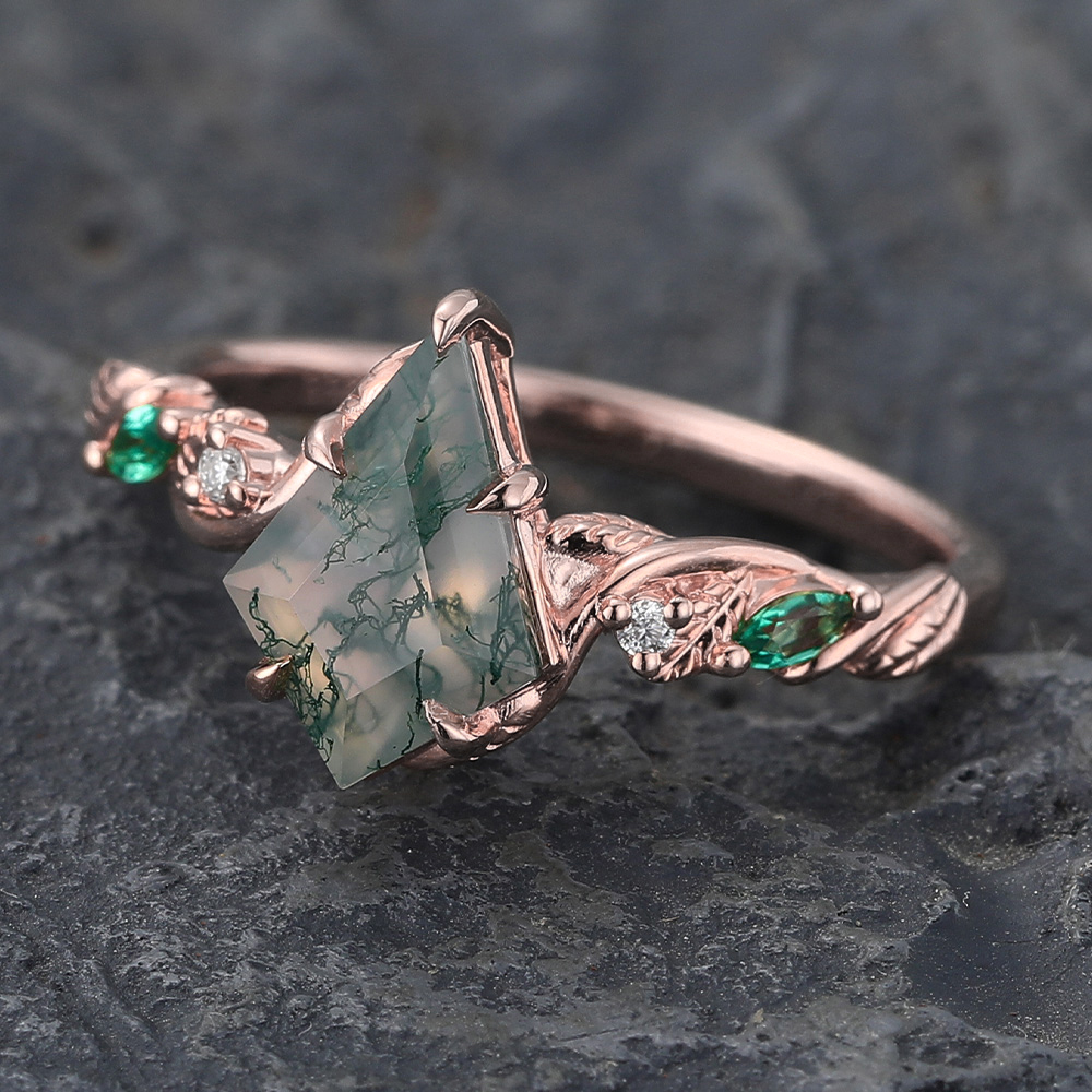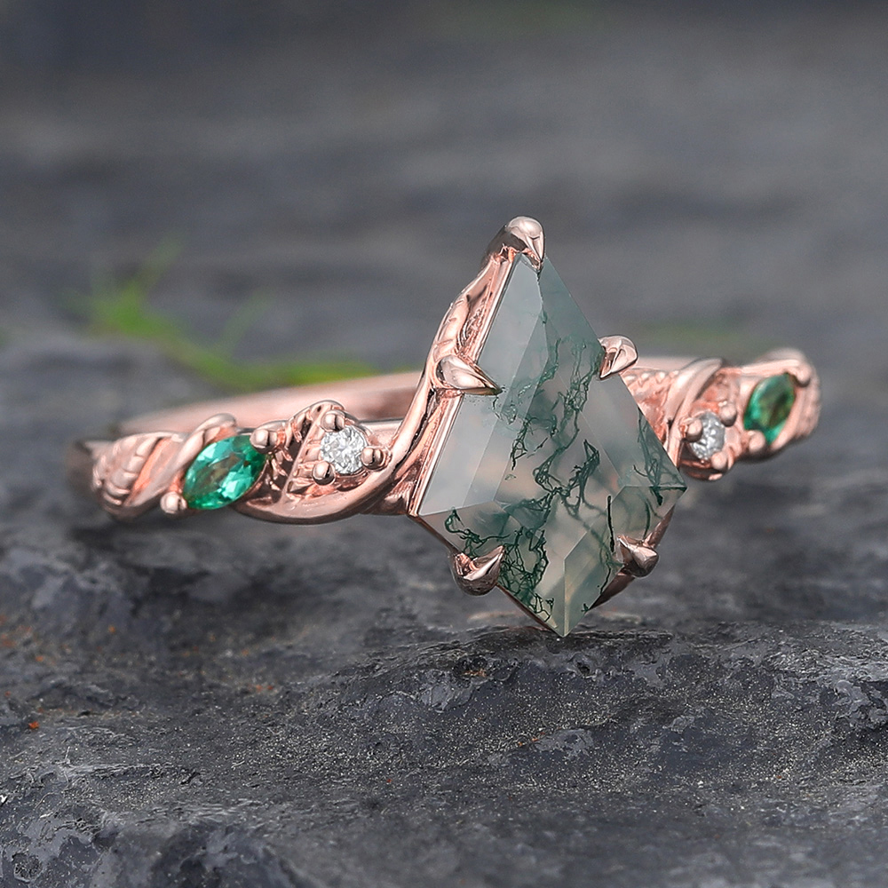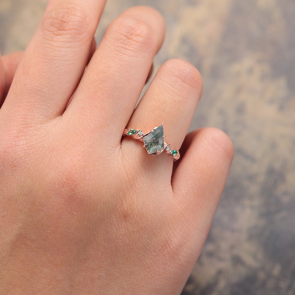 Kite Cut Moss Agate Engagement Ring with Emerald & Diamond Accented