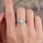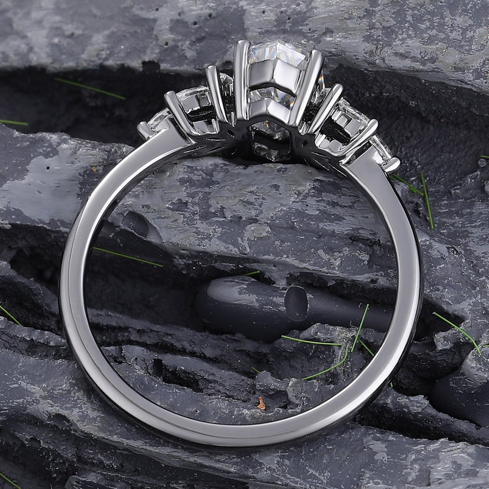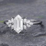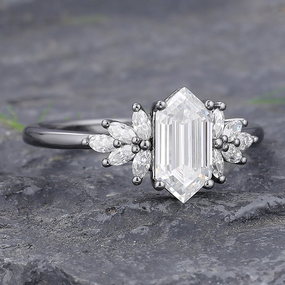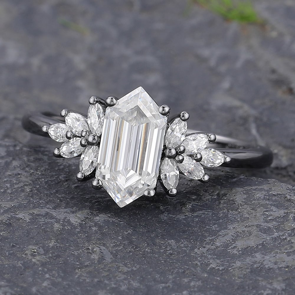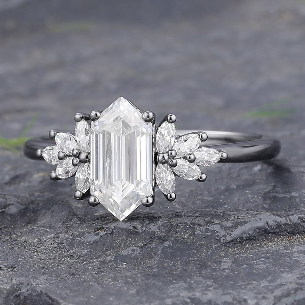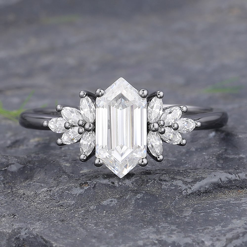 Long Hexagon Cut Moissanite Engagement Ring with Marquise Cluster