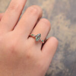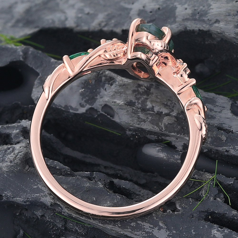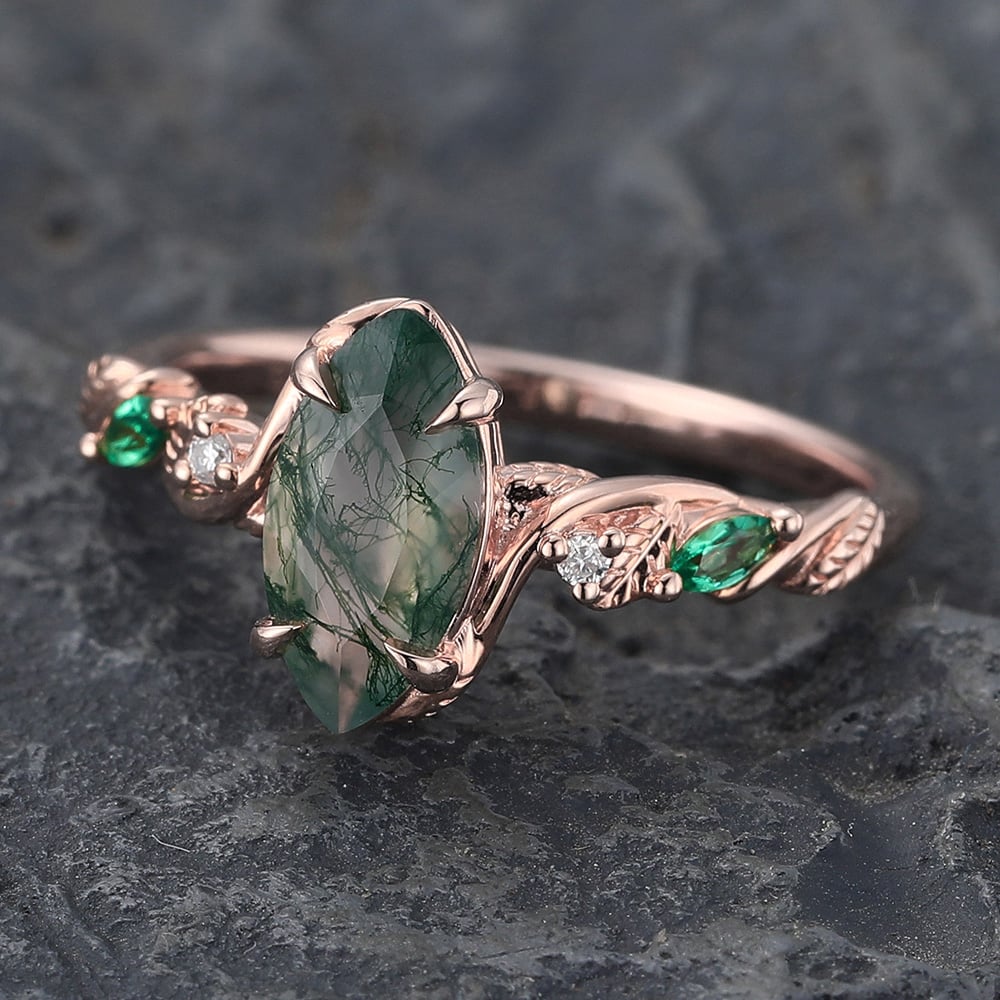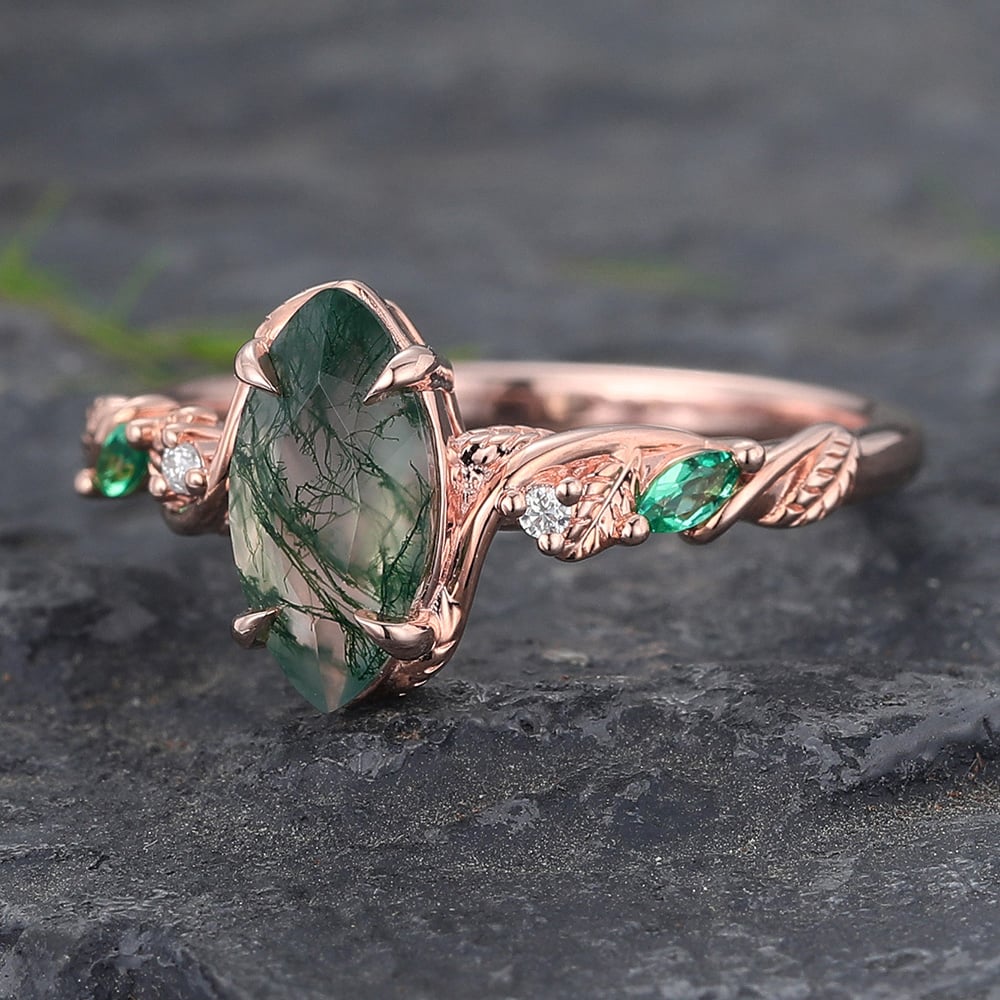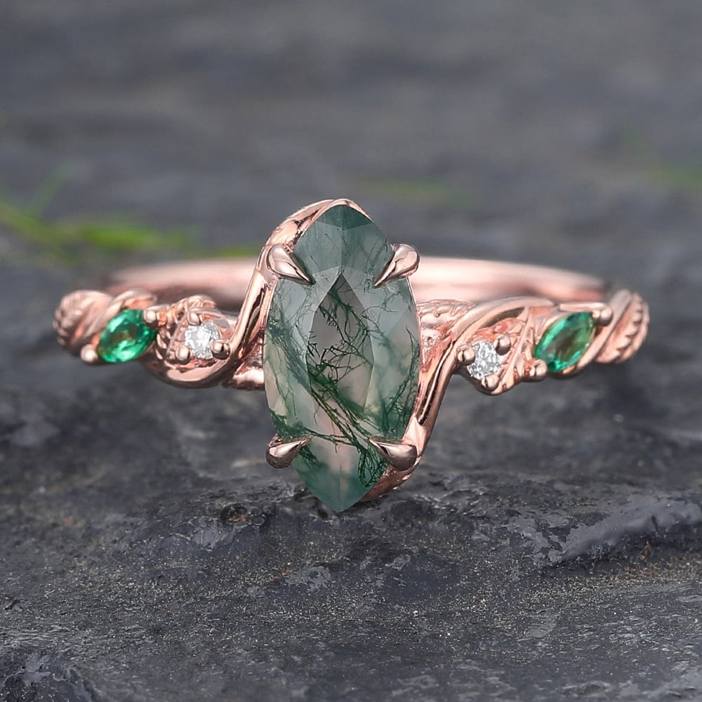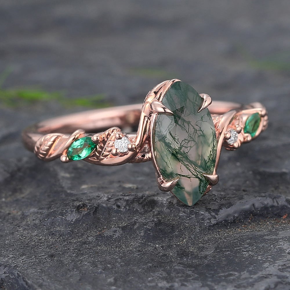 Marquise Cut Moss Agate Engagement Ring with Emerald & Diamond Accented