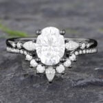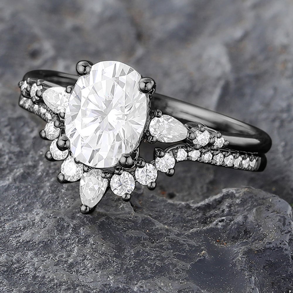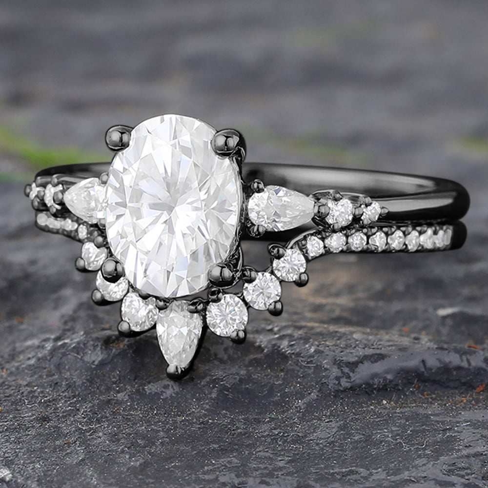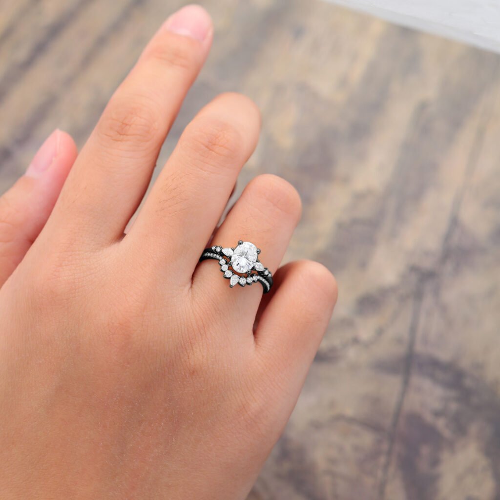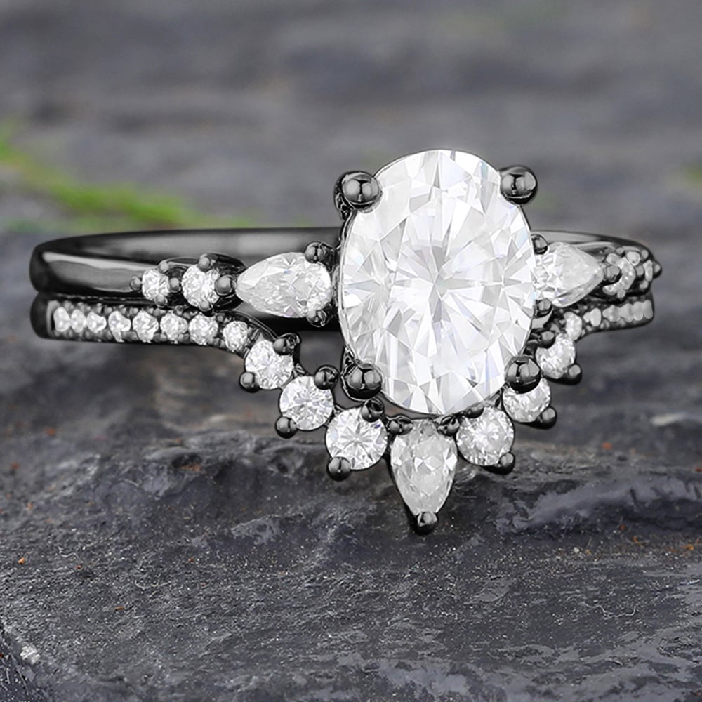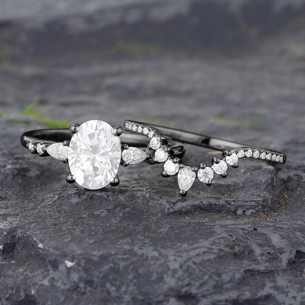 Oval Cut Moissanite Engagement Ring Set Black Gold Bridal Ring Set