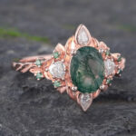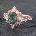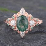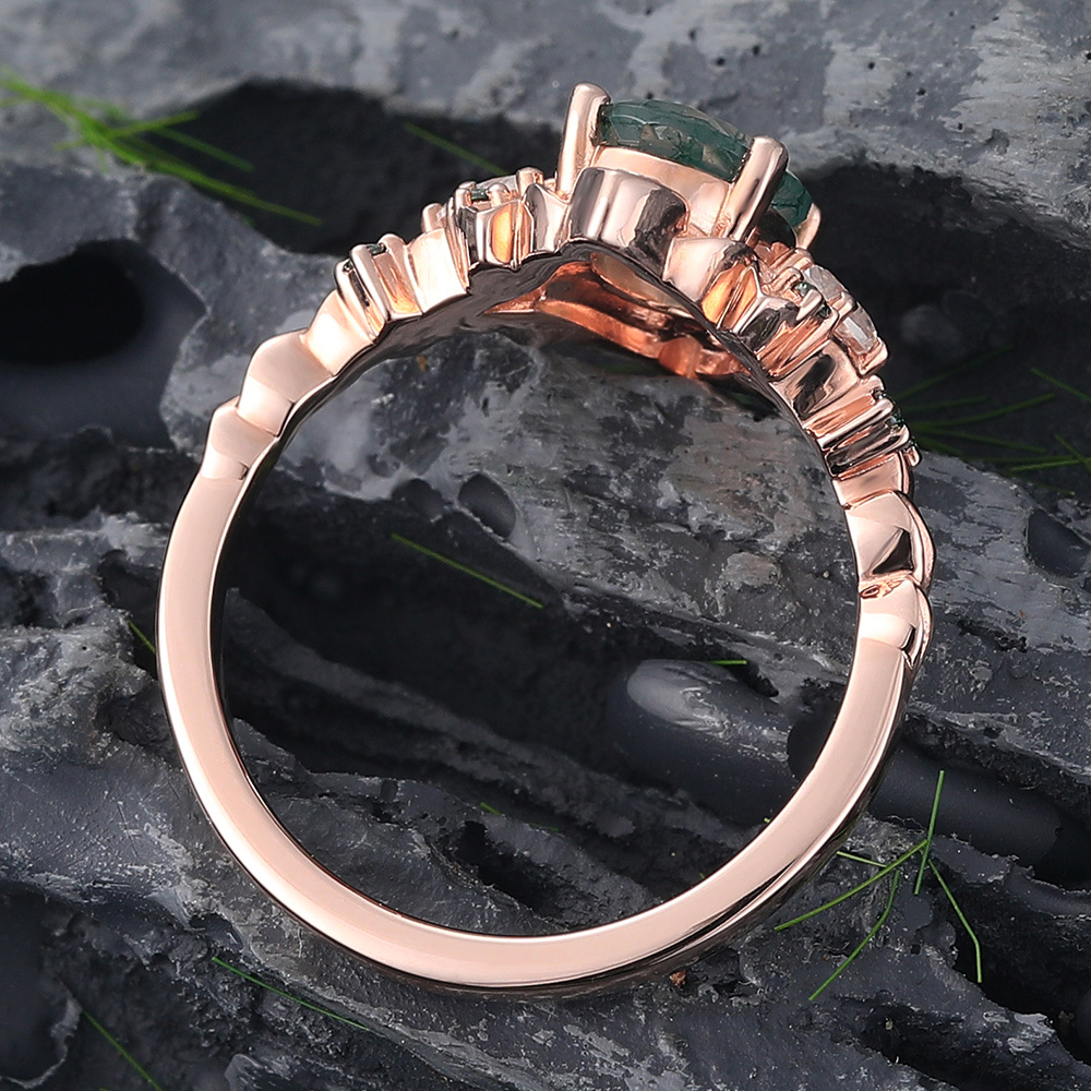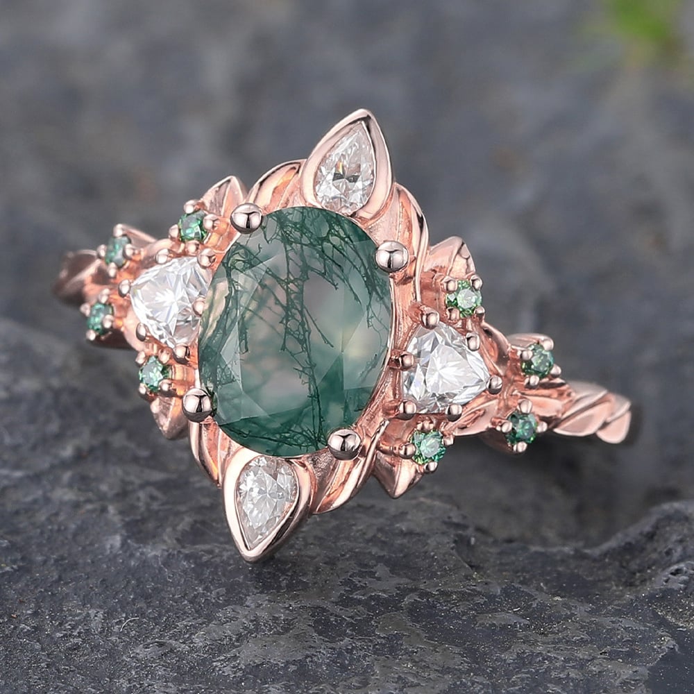 Rose Gold Moss Agate Engagement Ring Vintage Art Deco Ring