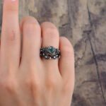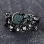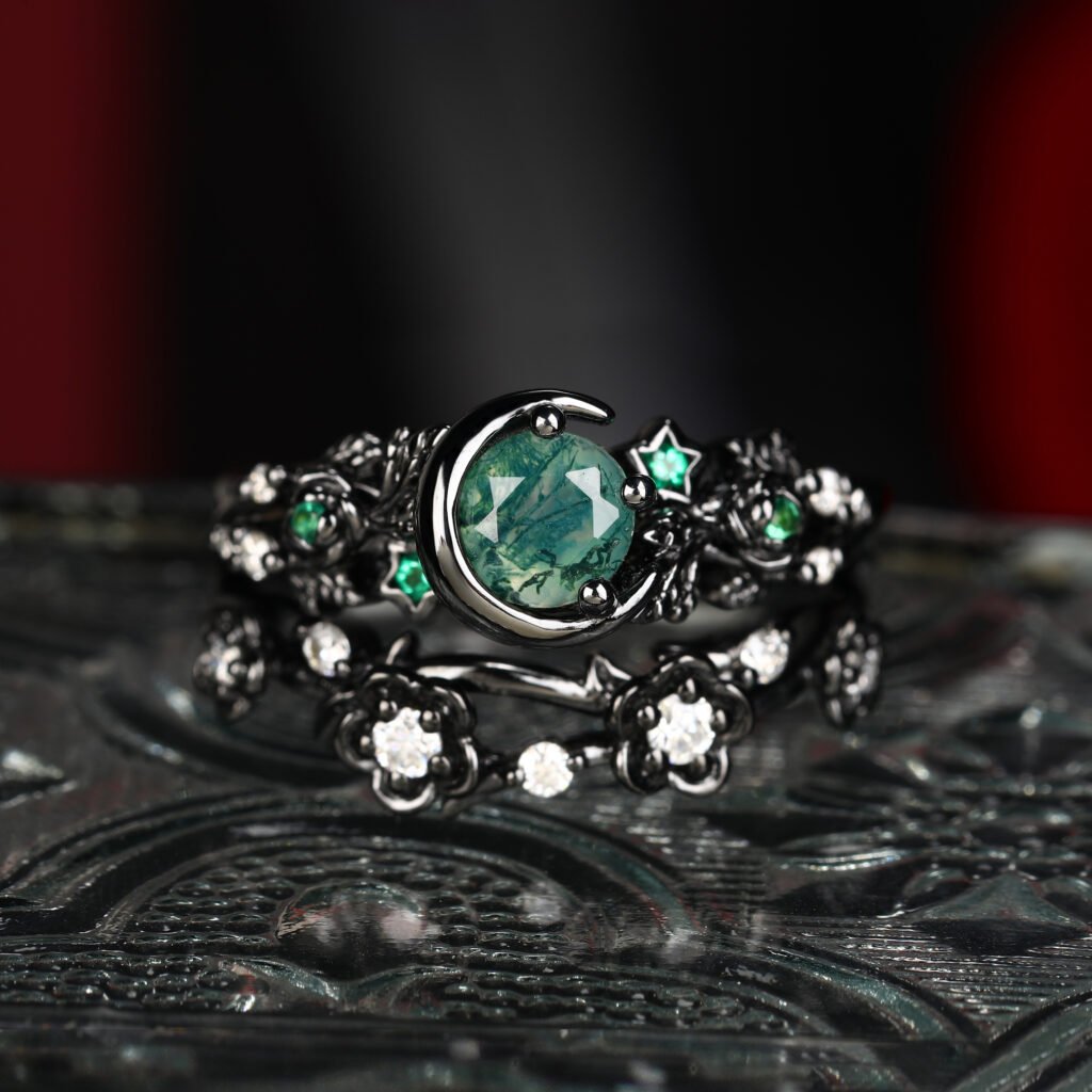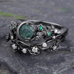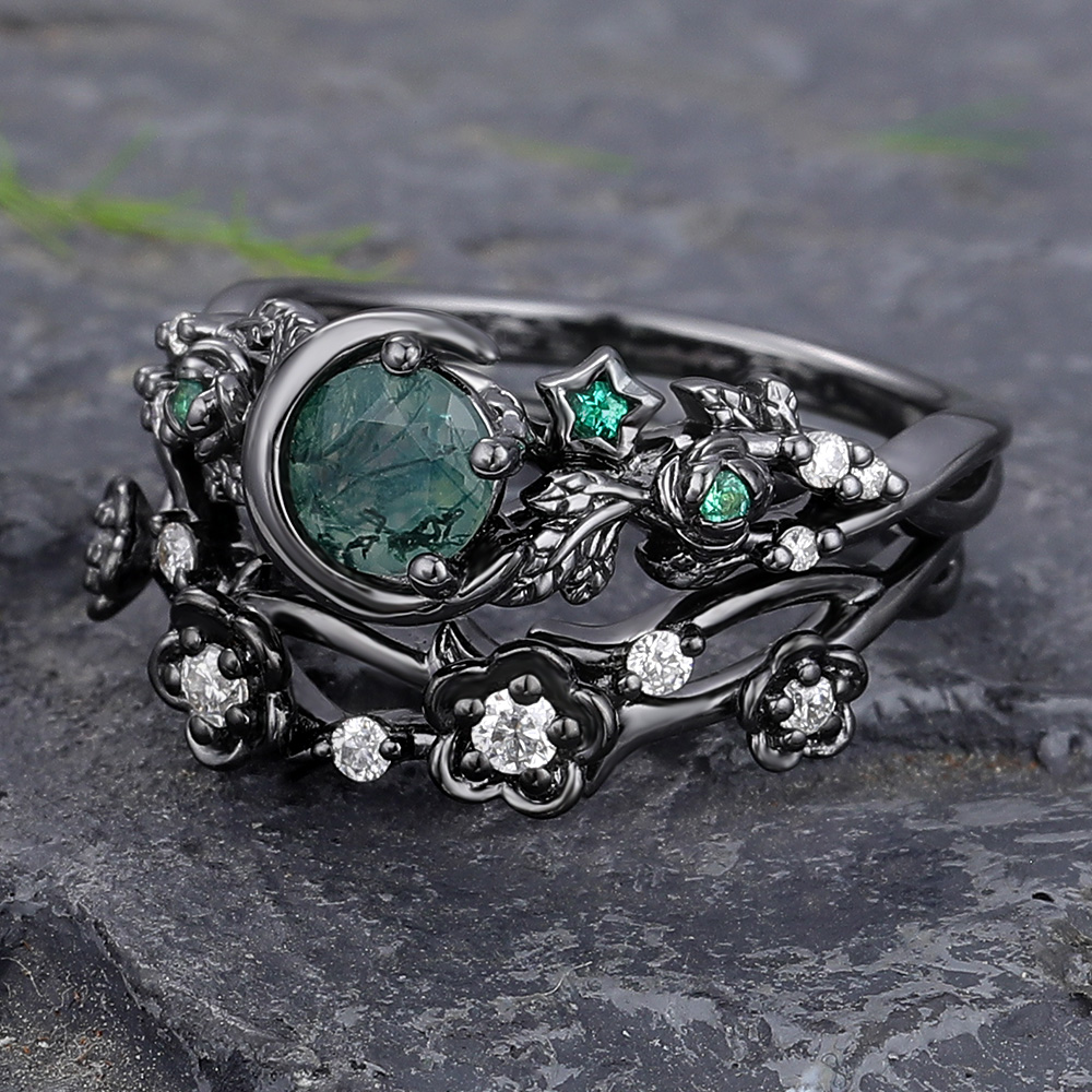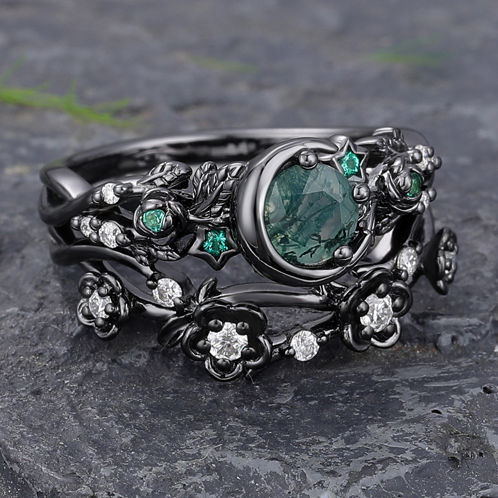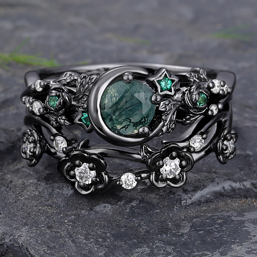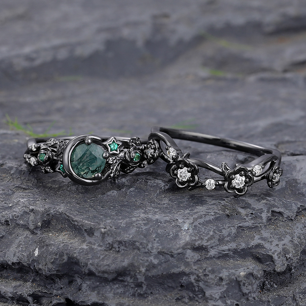 Round Cut Moss Agate Engagement Ring Set with Nature-Inspired Accents