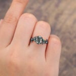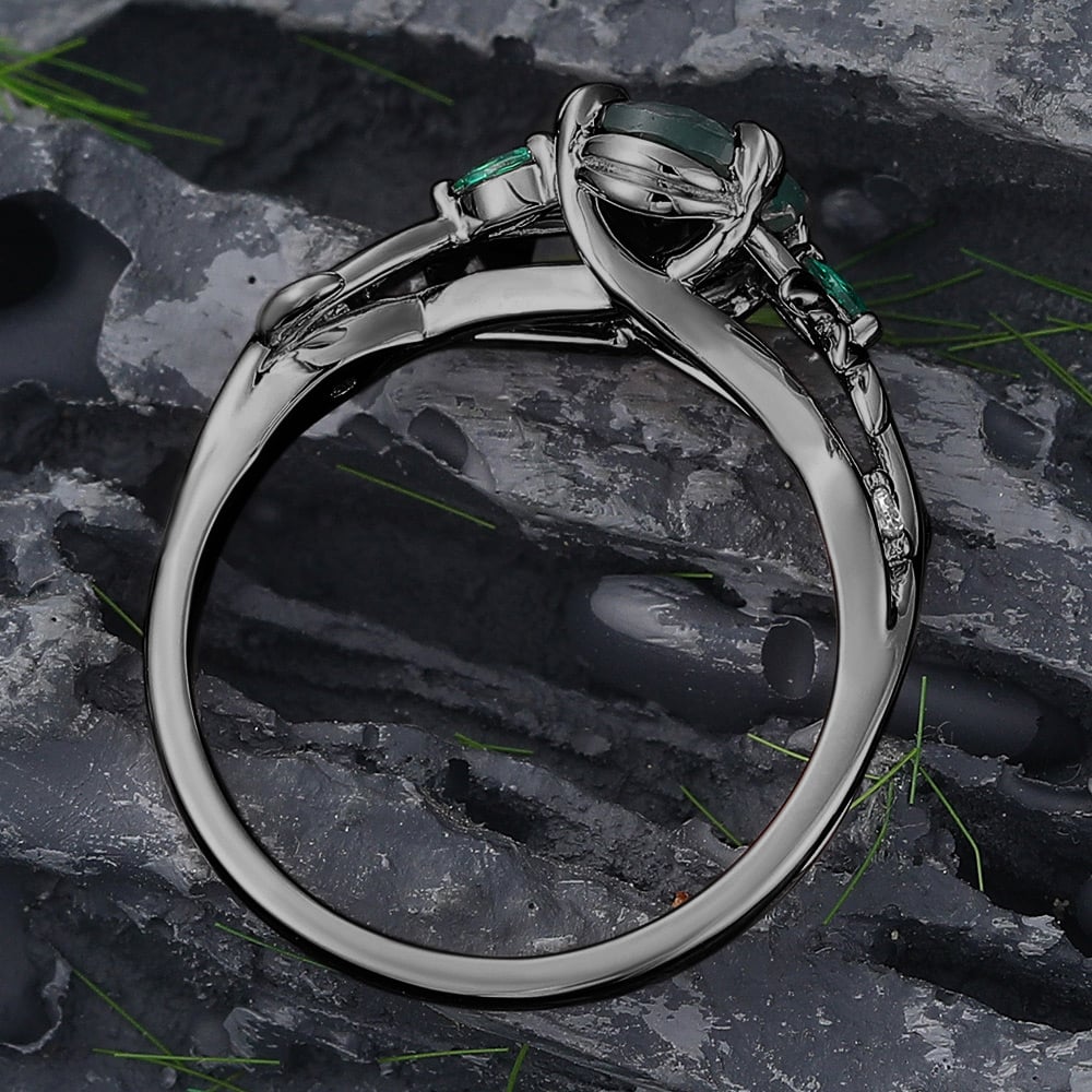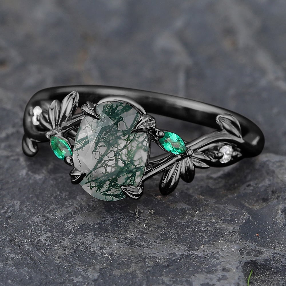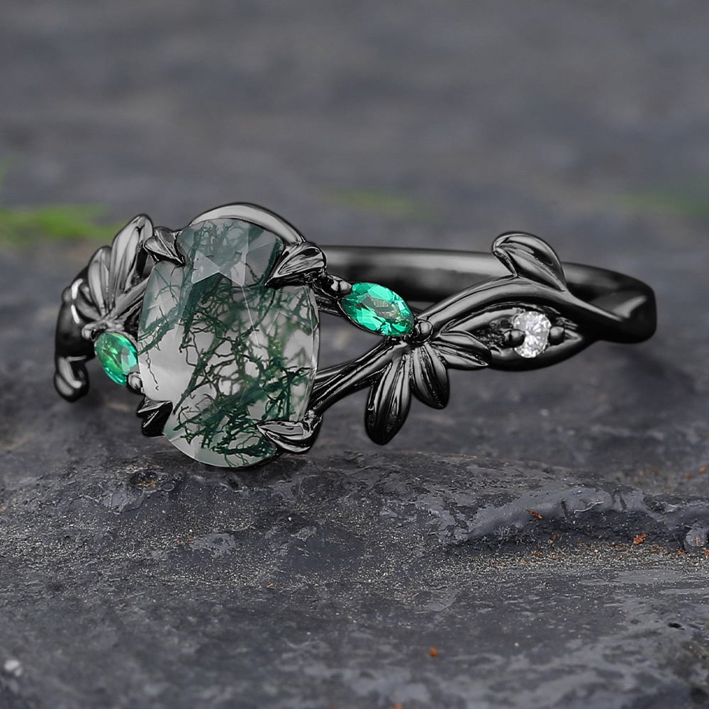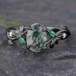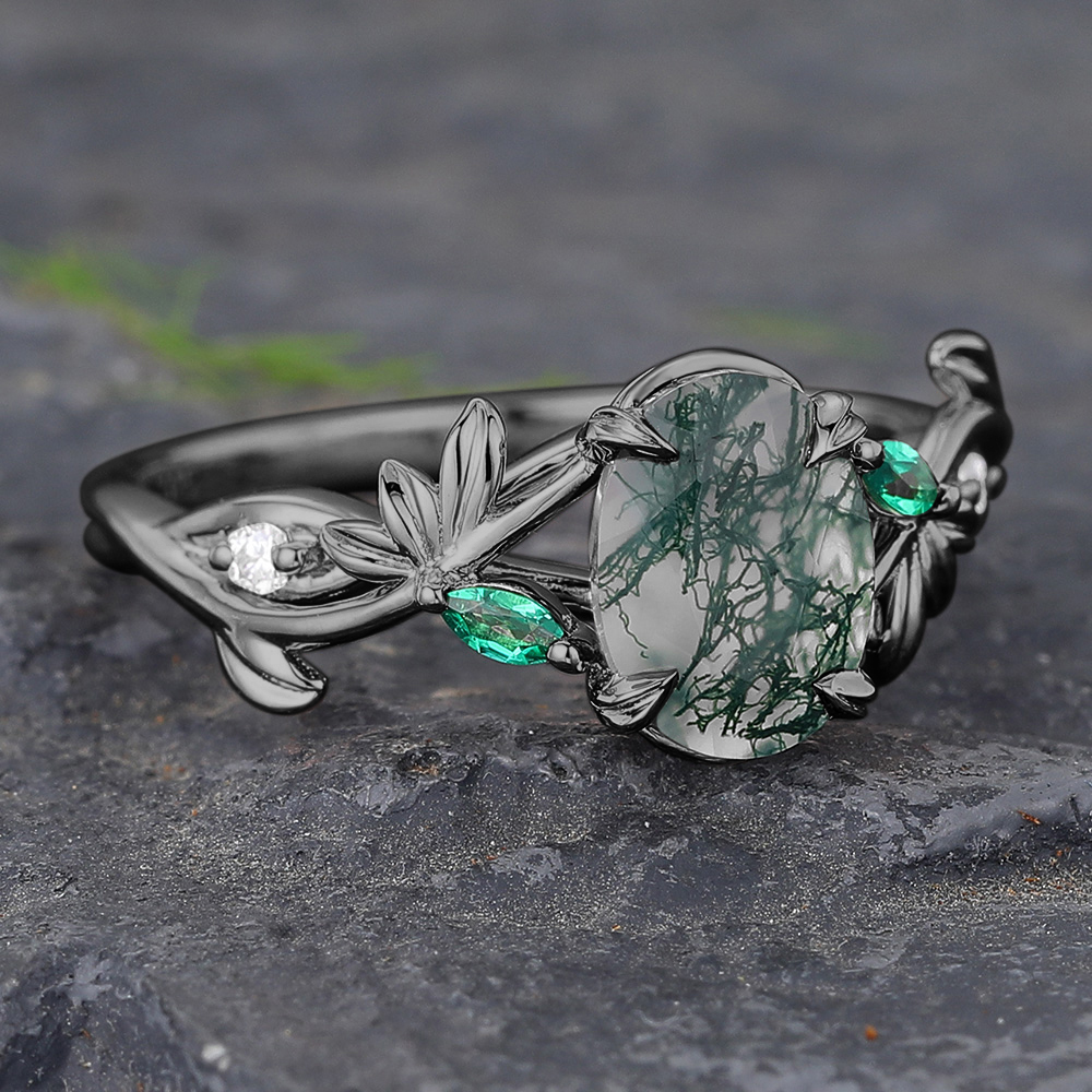 Vine Design Black Gold Oval Cut Moss Agate Split Shank Engagement Ring