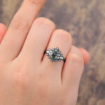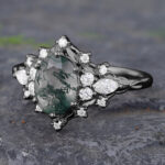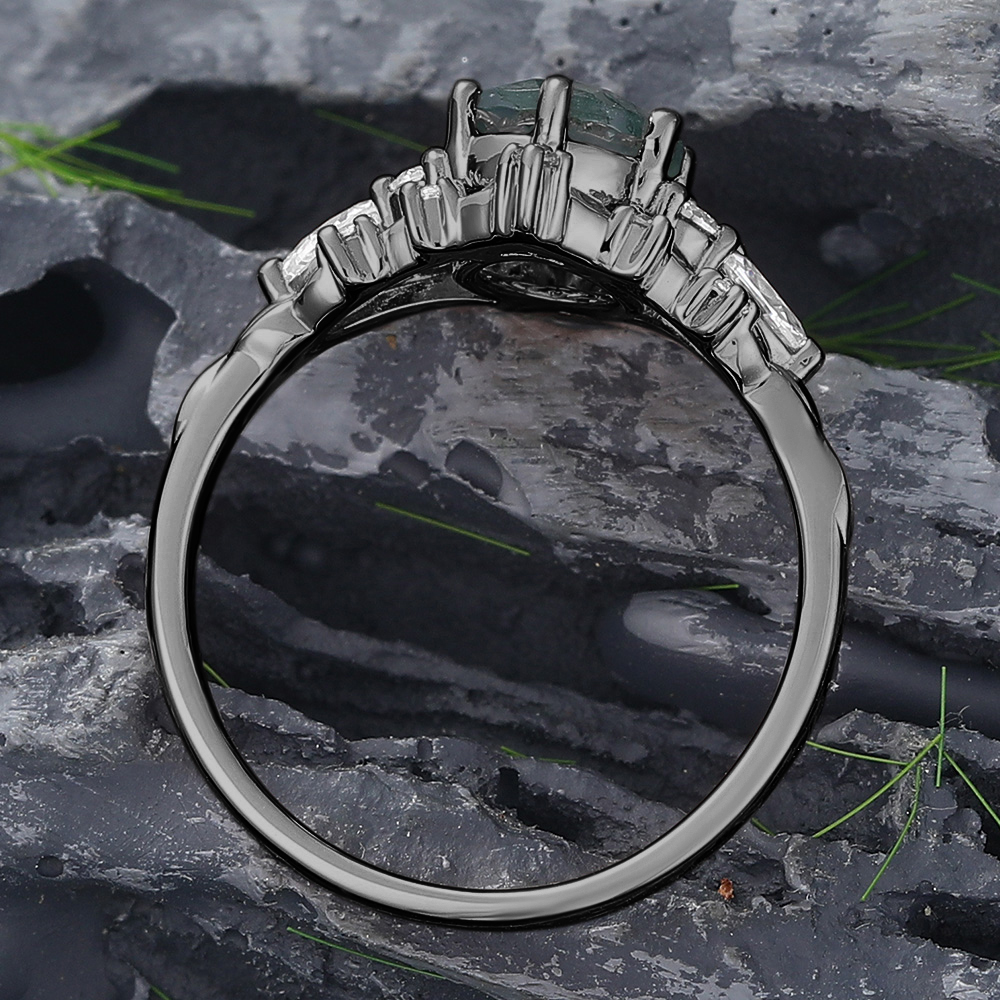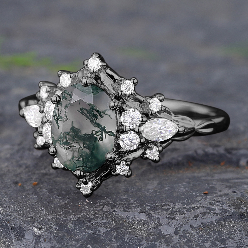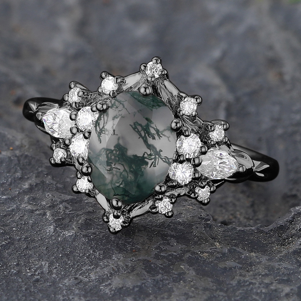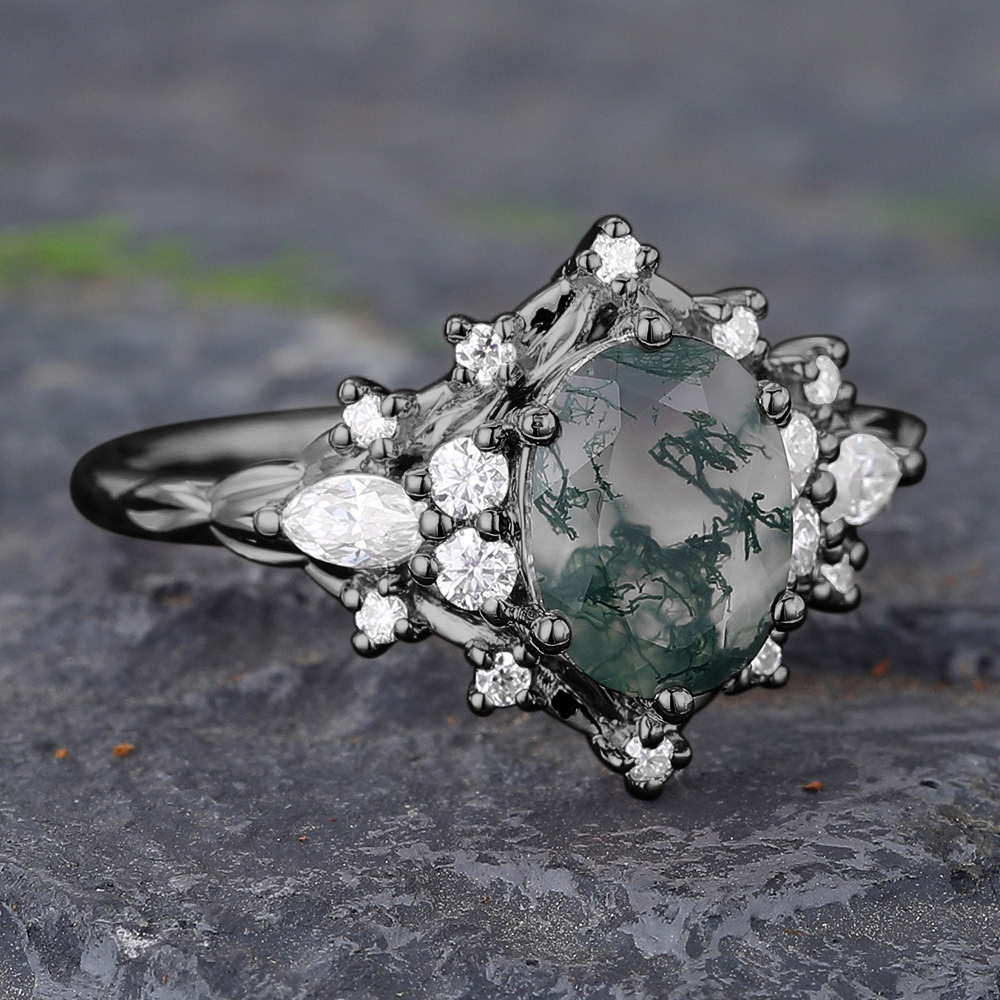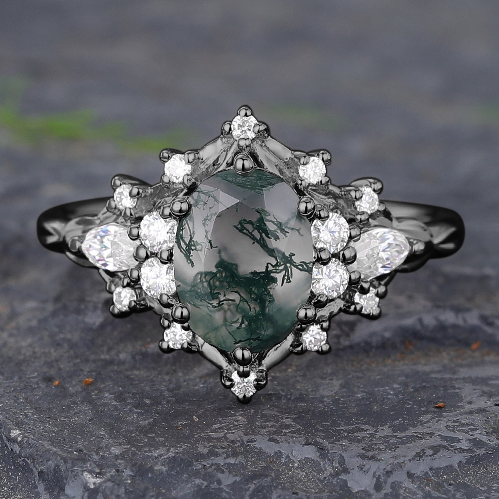 Vintage Oval Cut Moss Agate Cluster Engagement Ring Black Gold